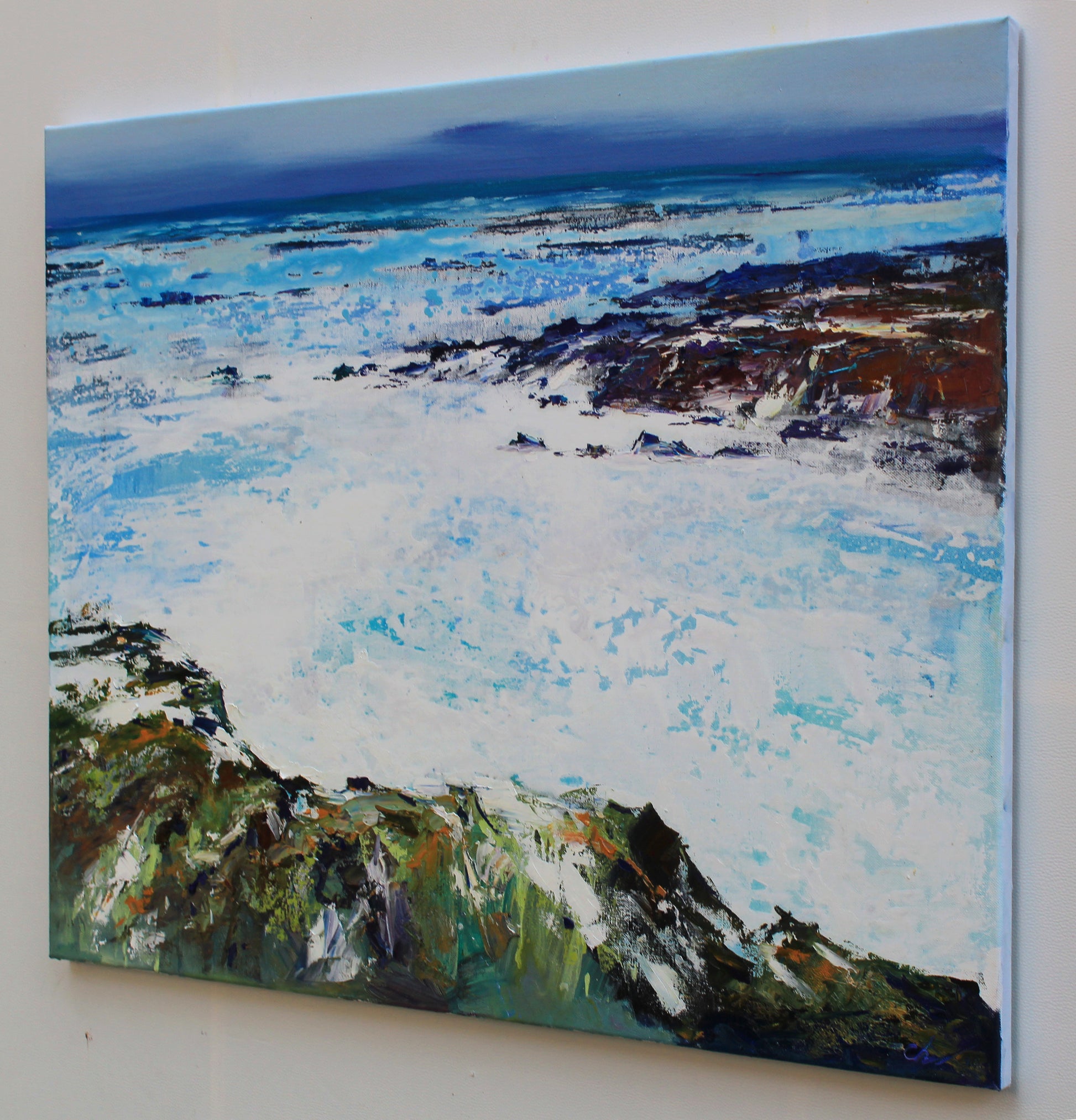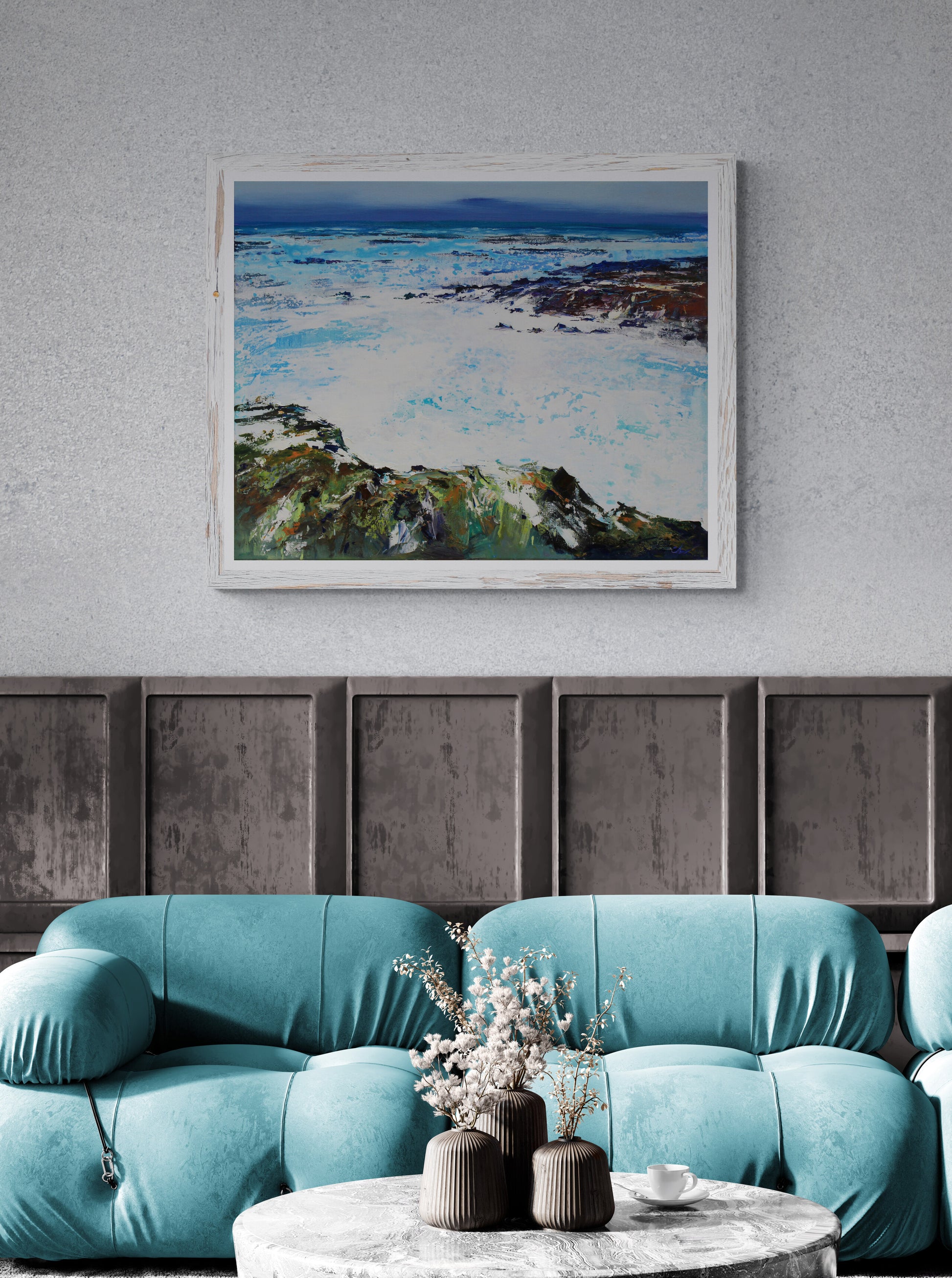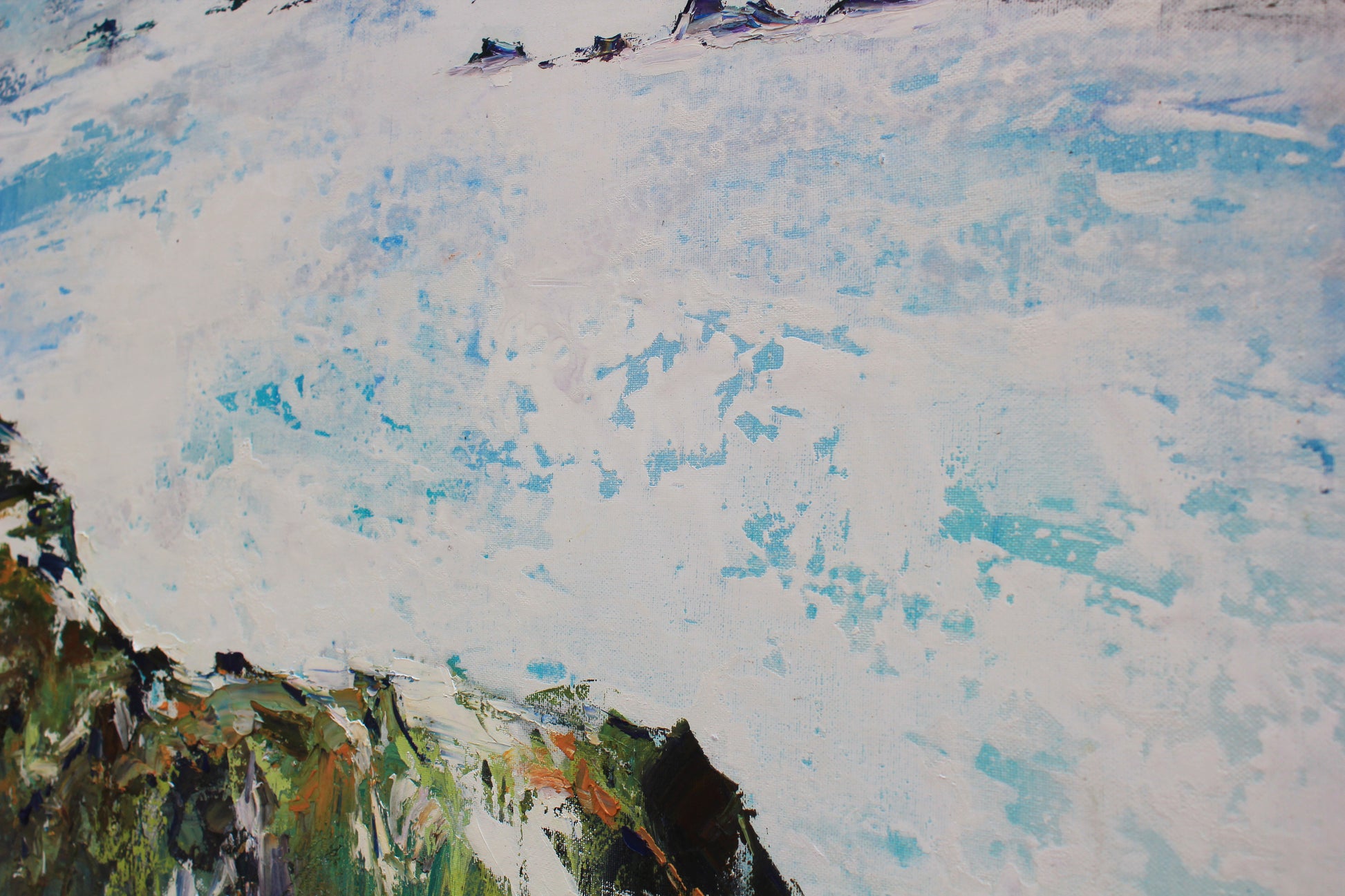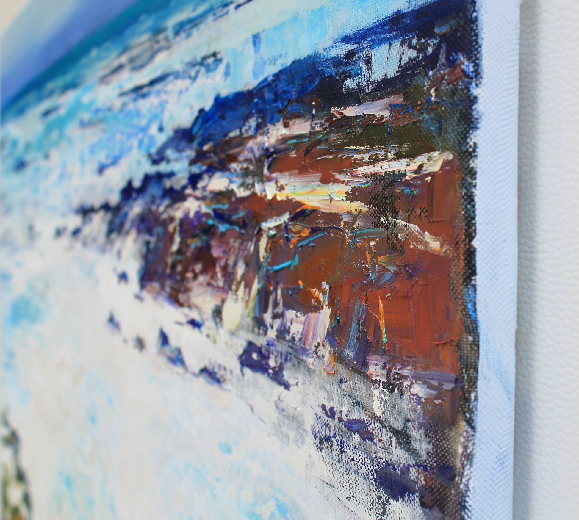 Oil painting landscape with a stormy sea, painted in the style of impressionist art, realistic art, expressionist art. The incredible beauty of the waves beating against the rocks inspired the artist to create the painting "Coast".