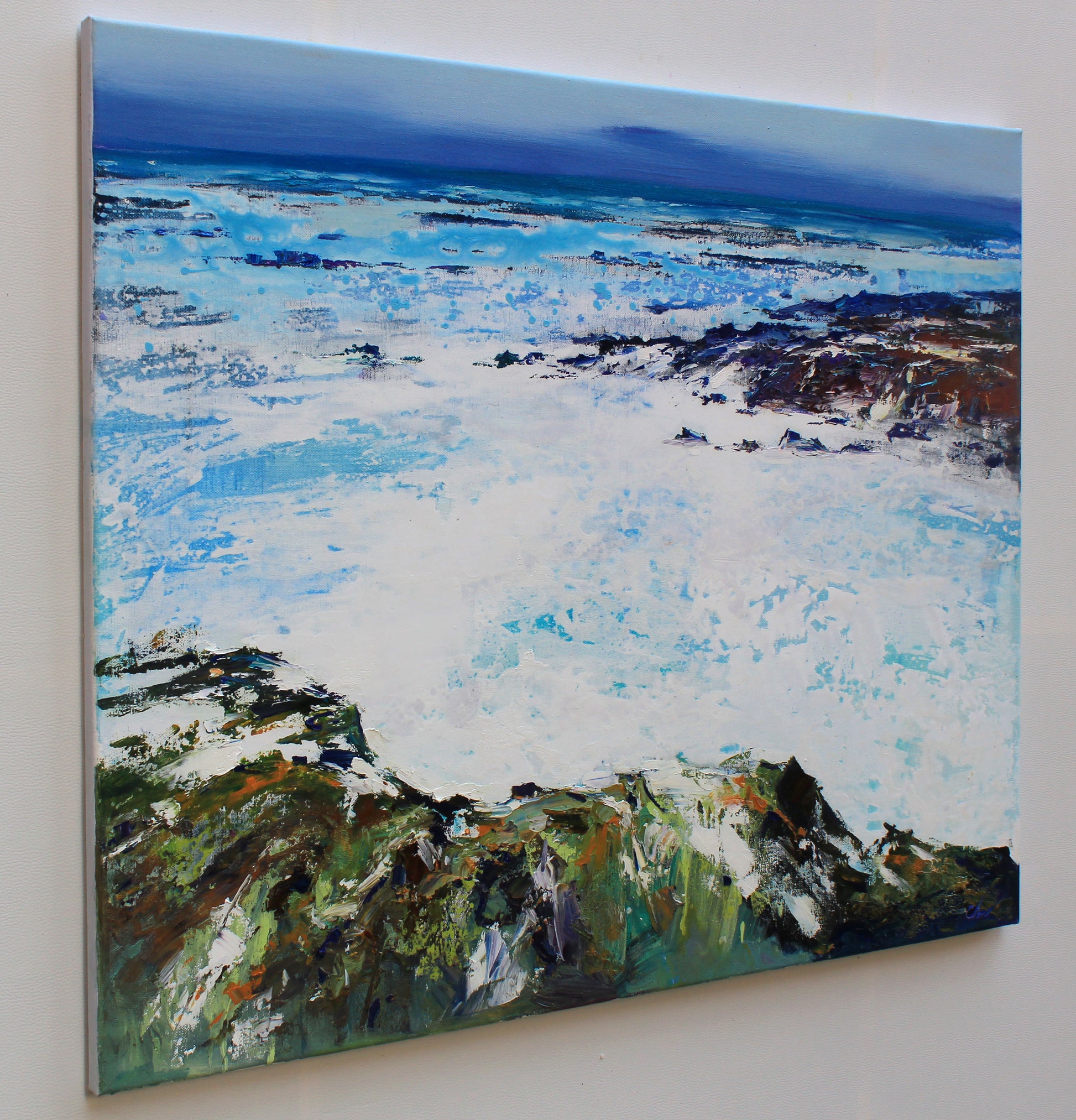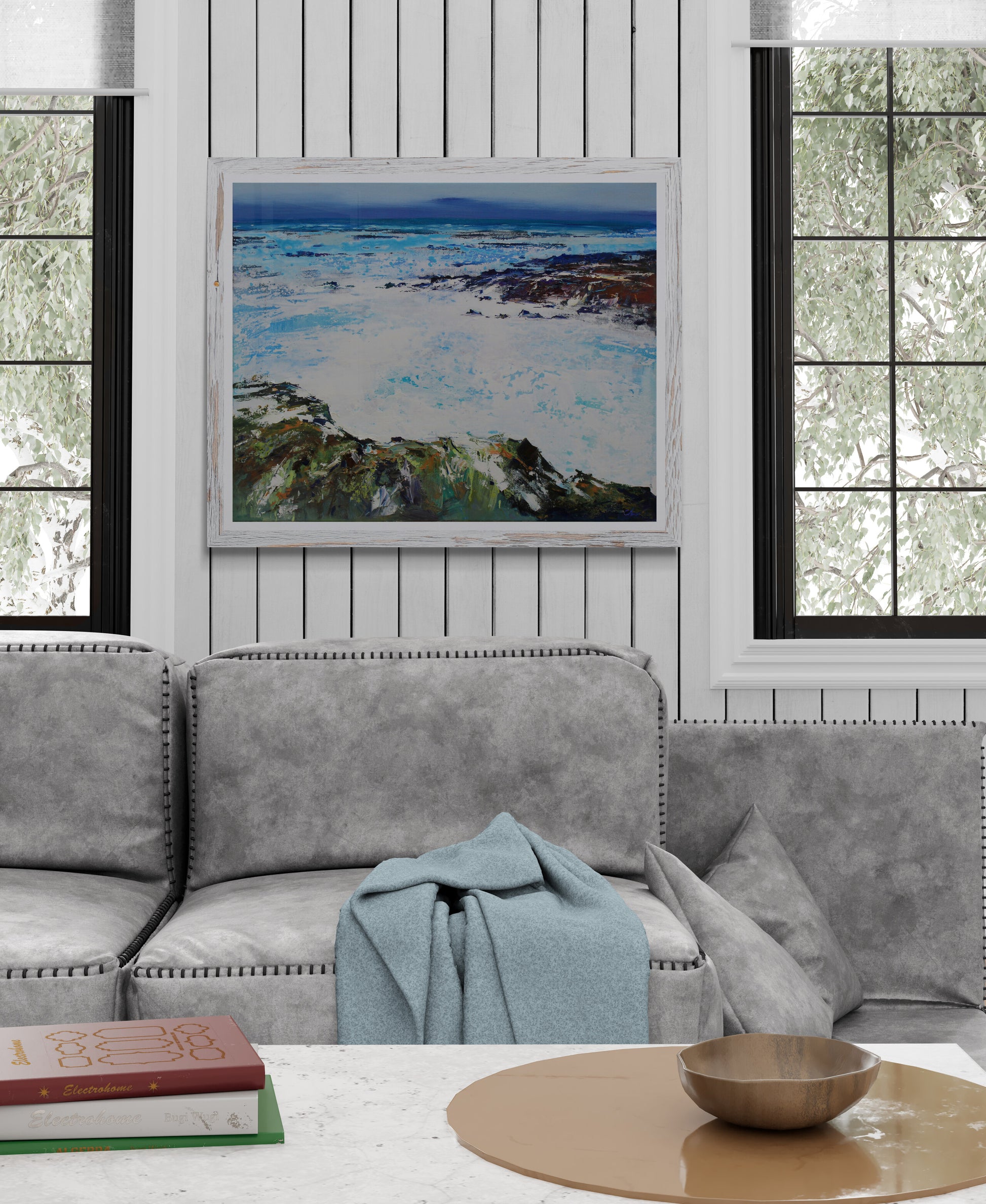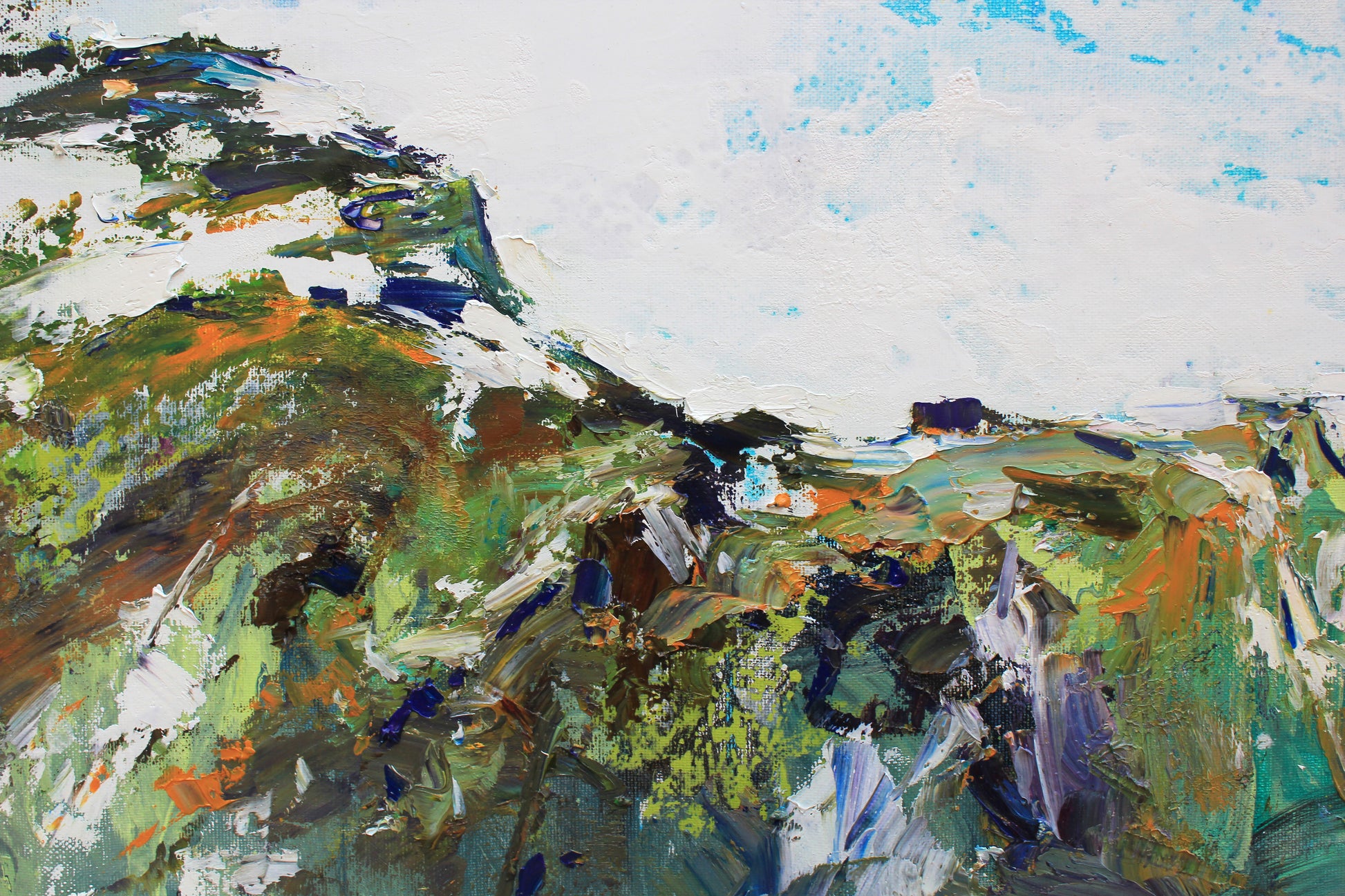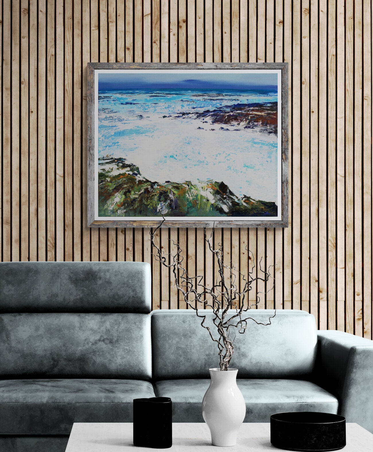 Oil painting landscape with a stormy sea, painted in the style of impressionist art, realistic art, expressionist art. The incredible beauty of the waves beating against the rocks inspired the artist to create the painting "Coast".