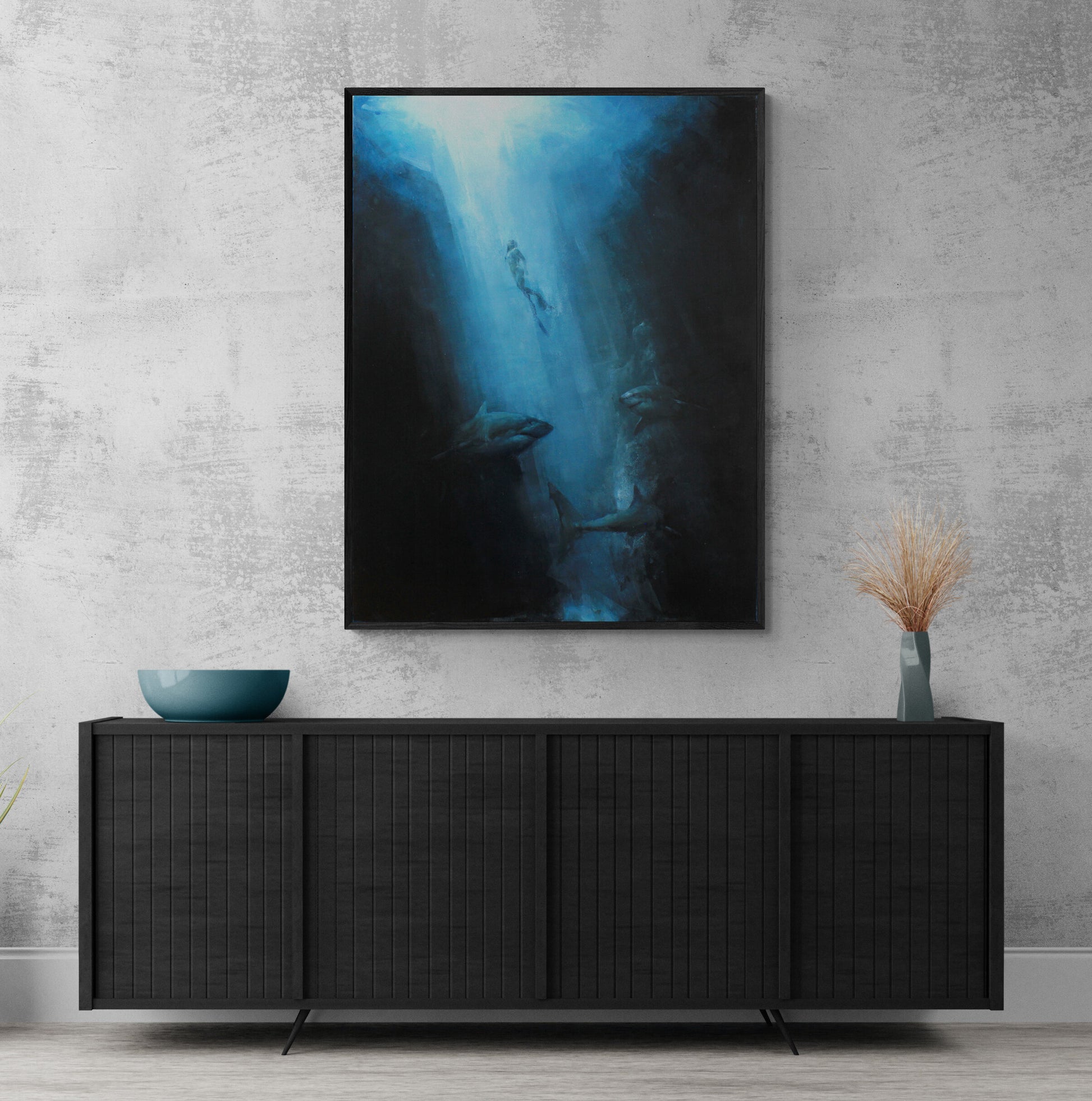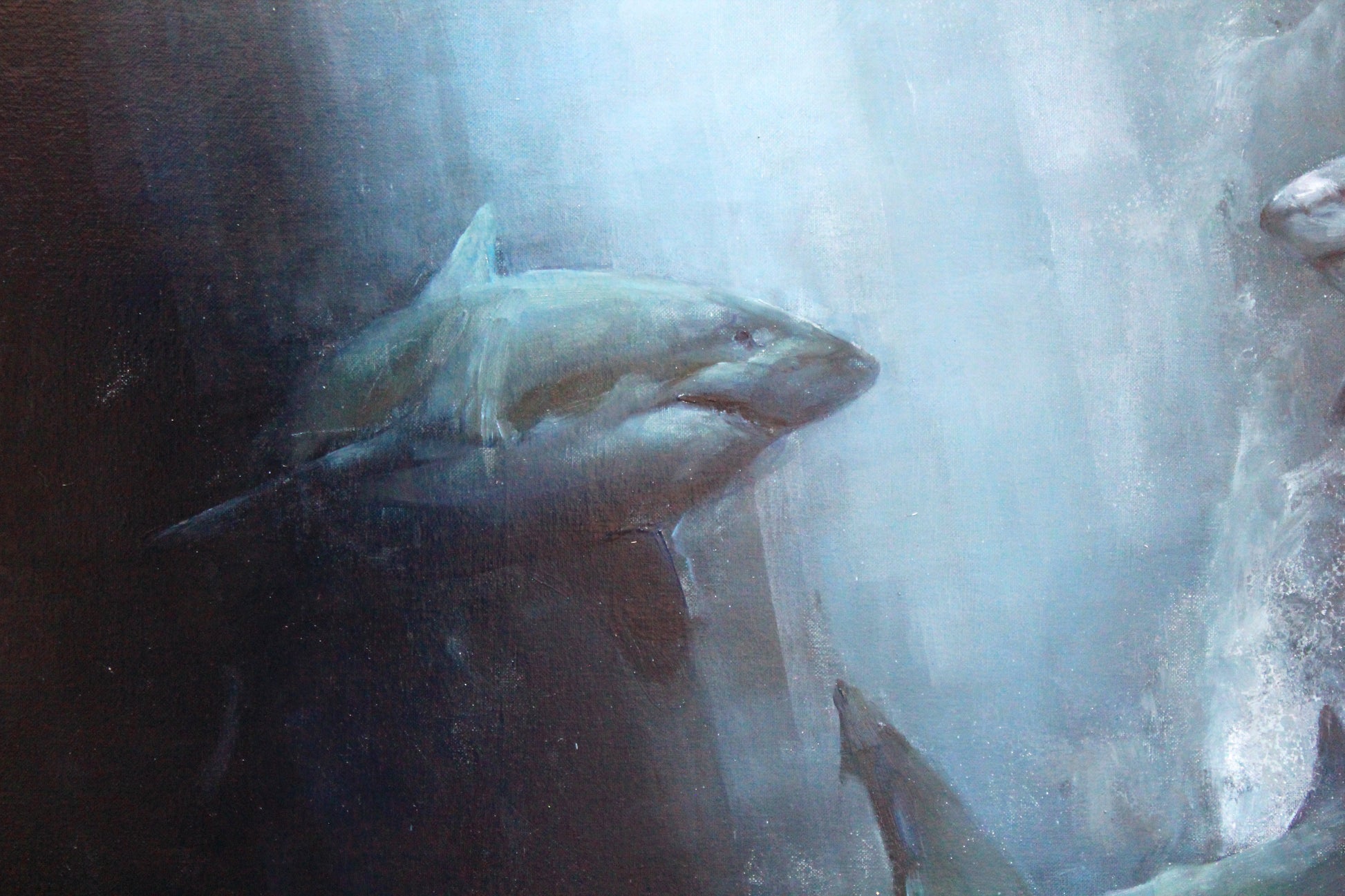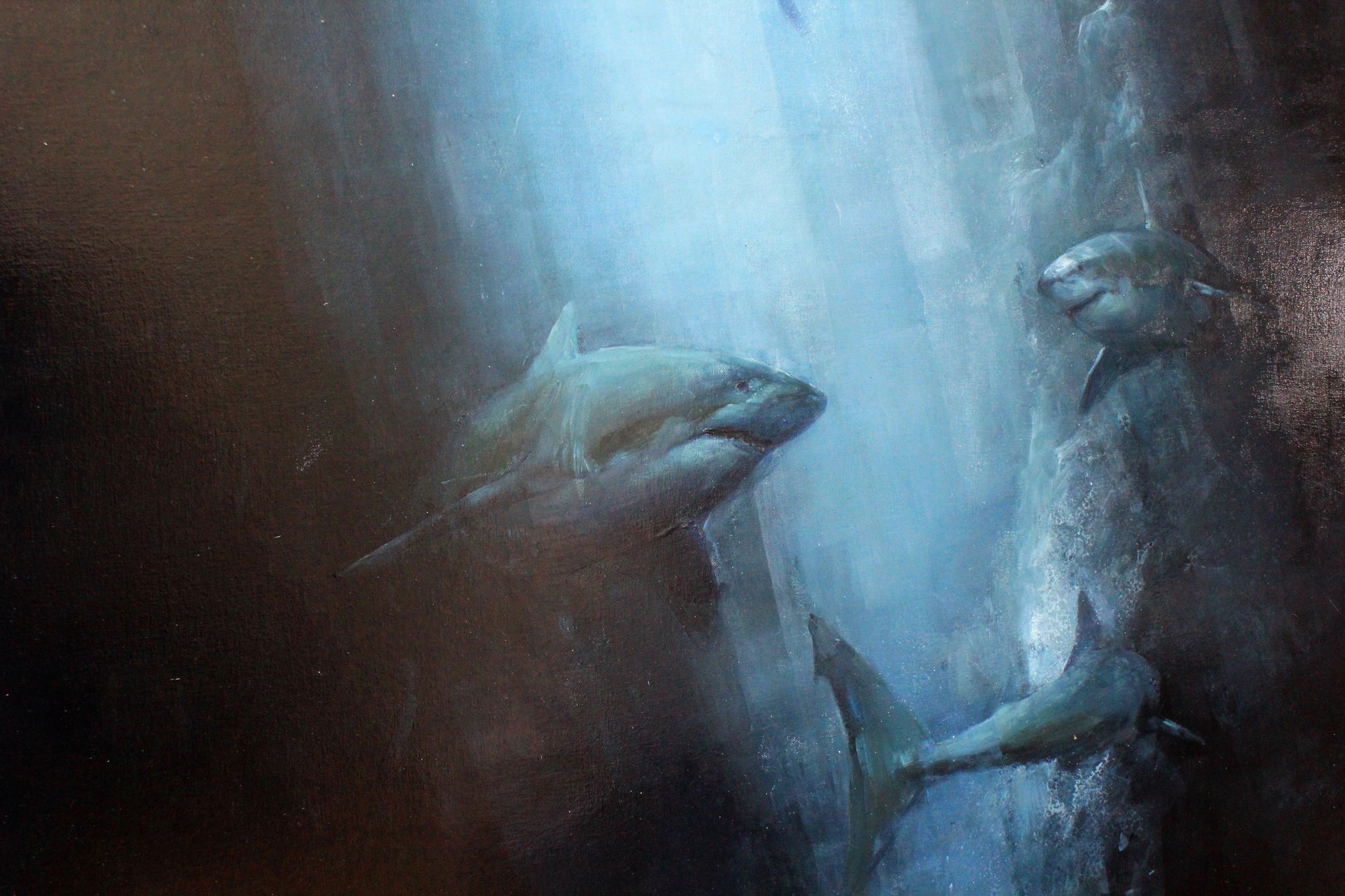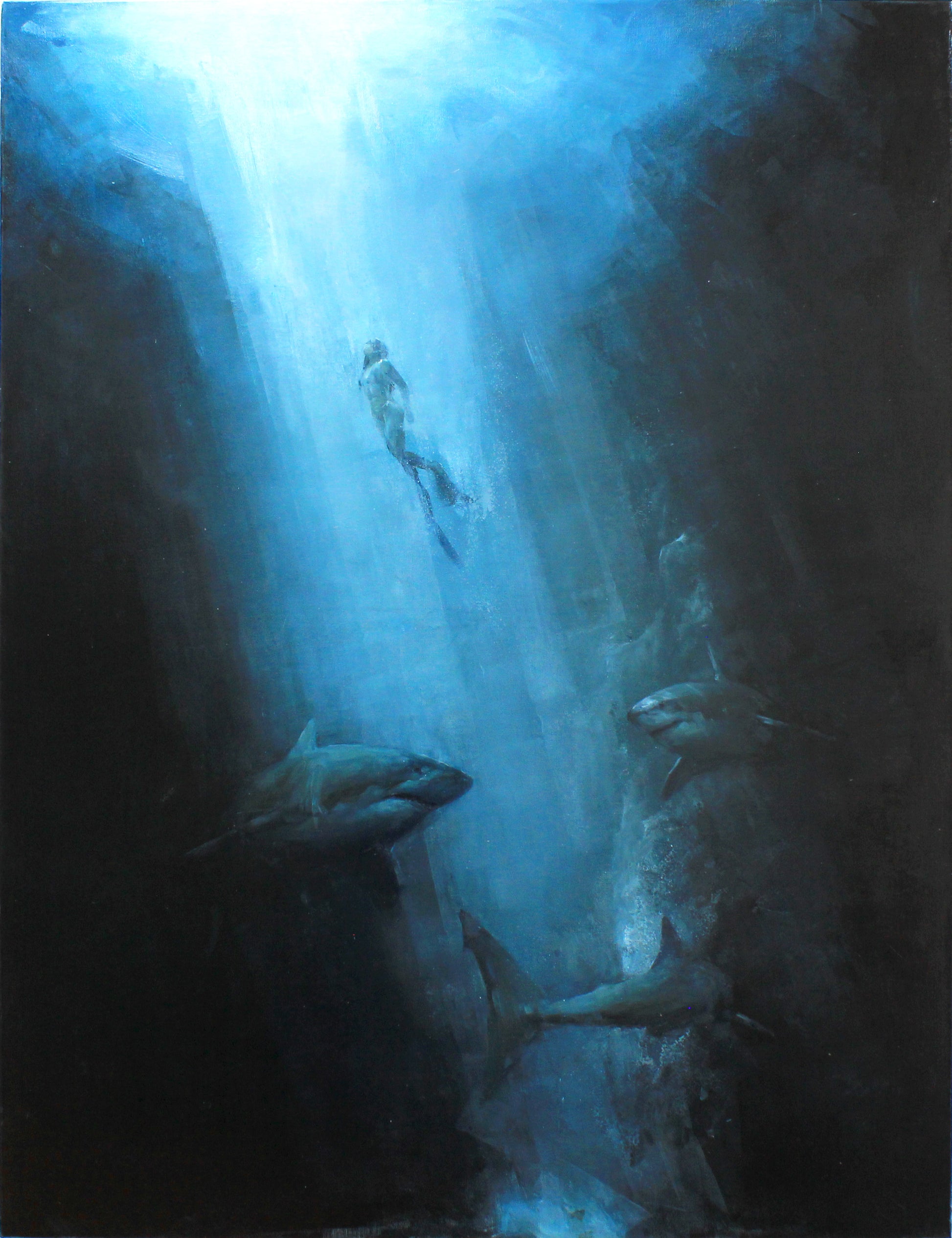 The painting depicts sharks against the backdrop of bottomless blue water.