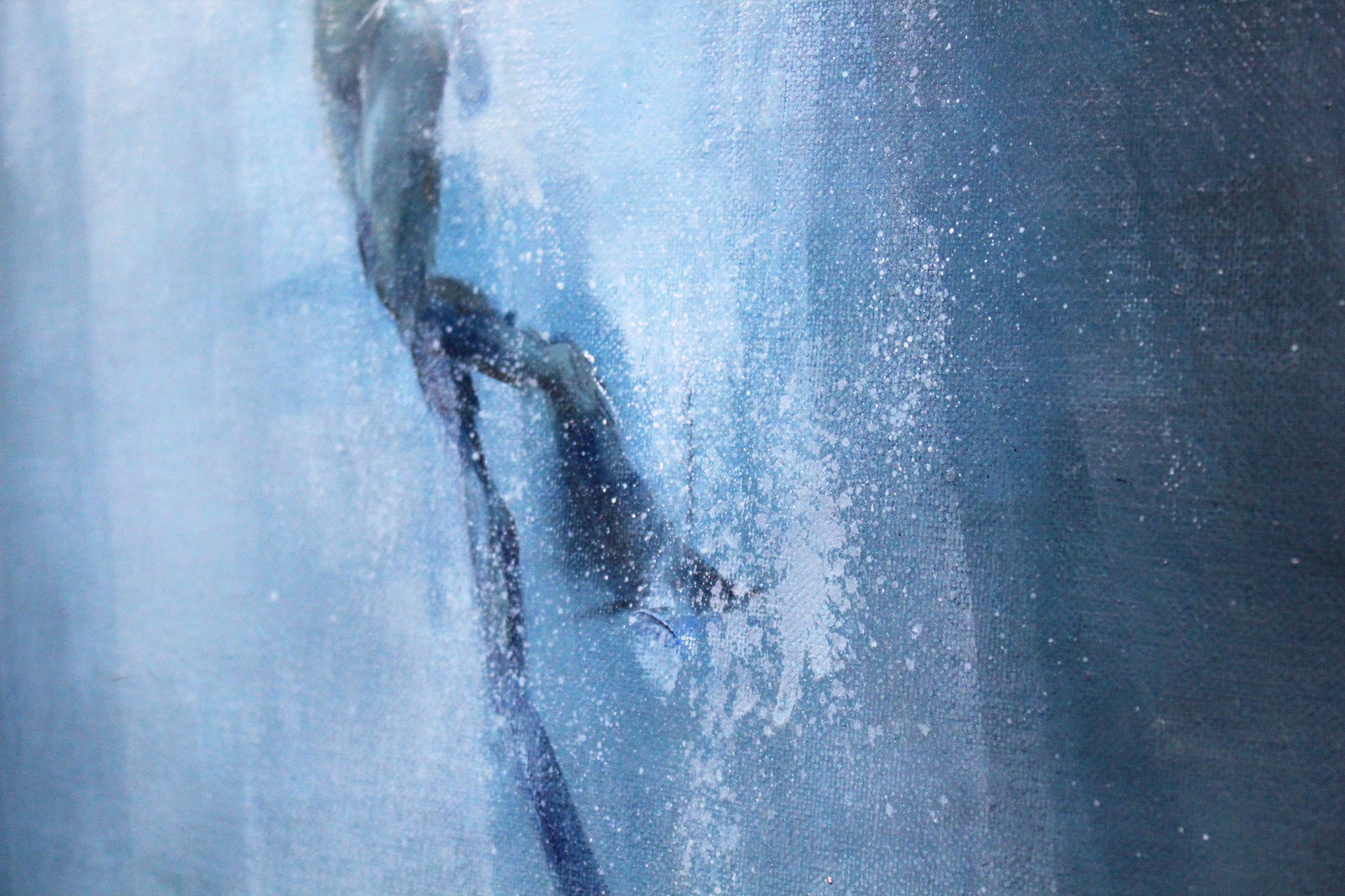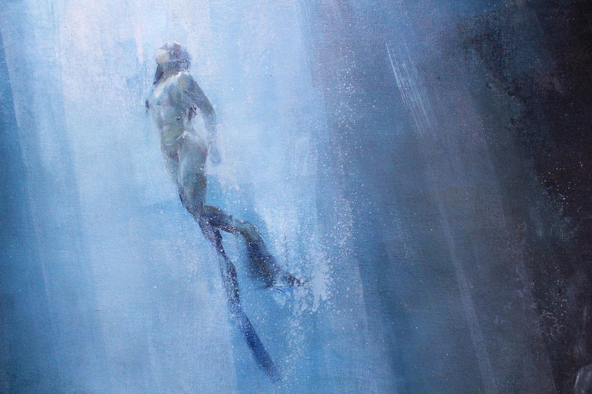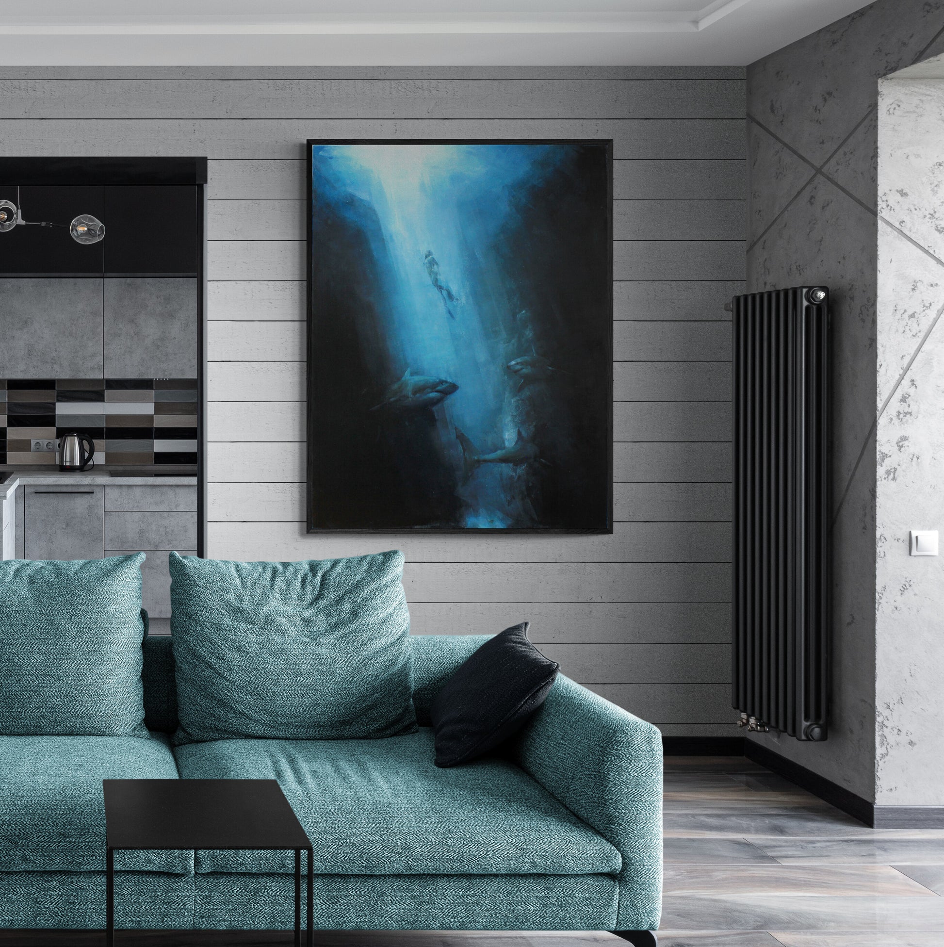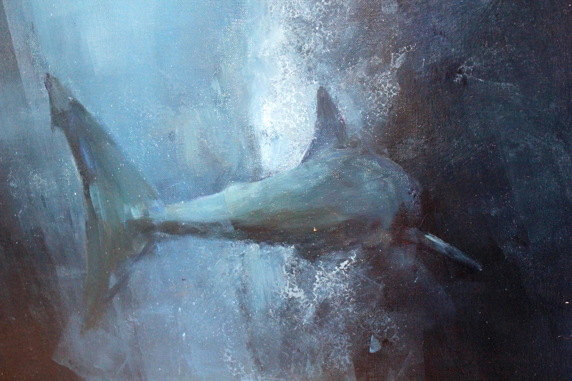 The painting depicts sharks against the backdrop of bottomless blue water.