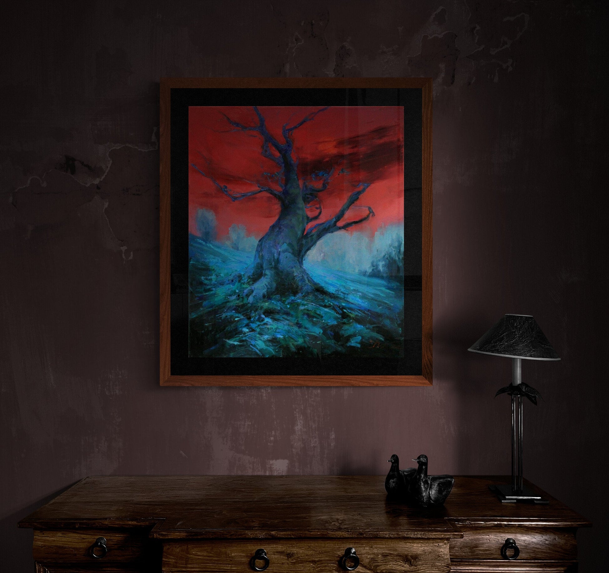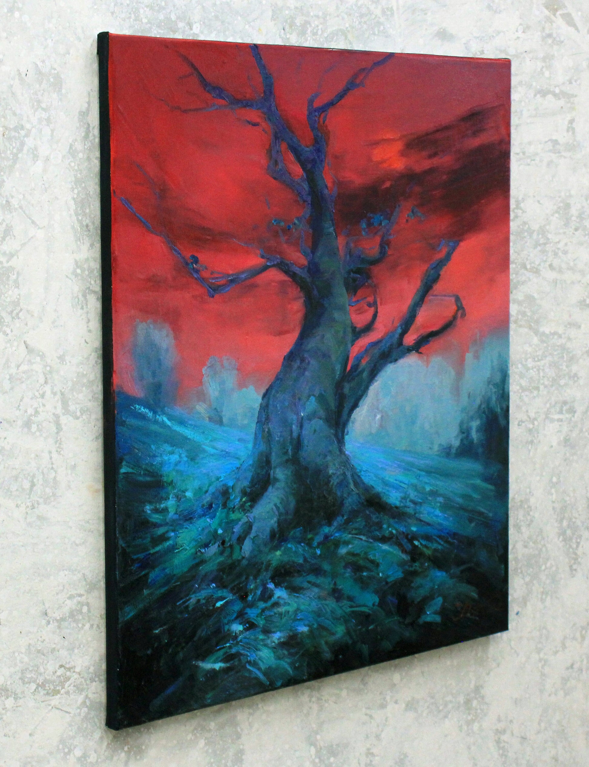The beauty of the forest inspired the artist to create the painting "Red Moon Time".