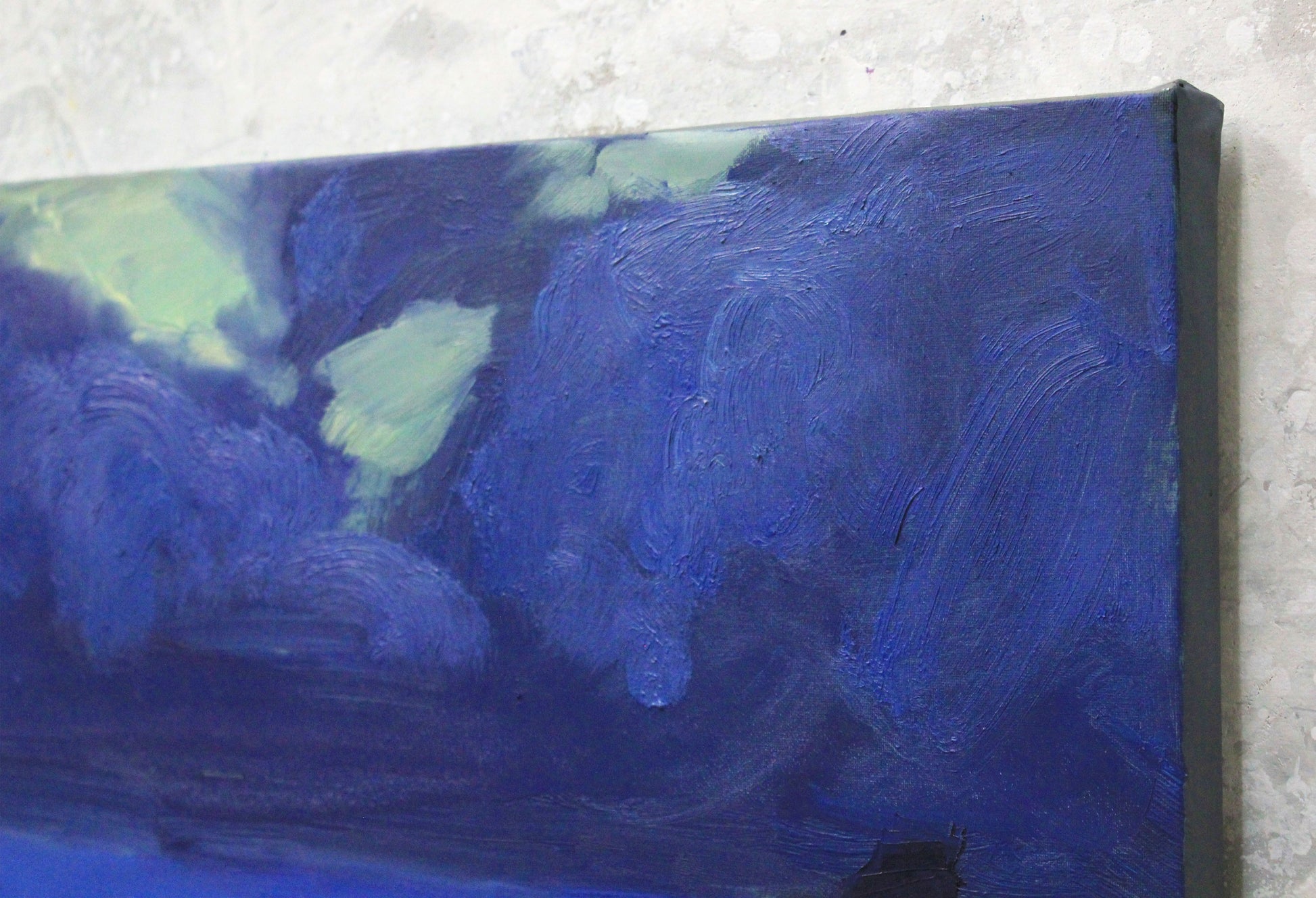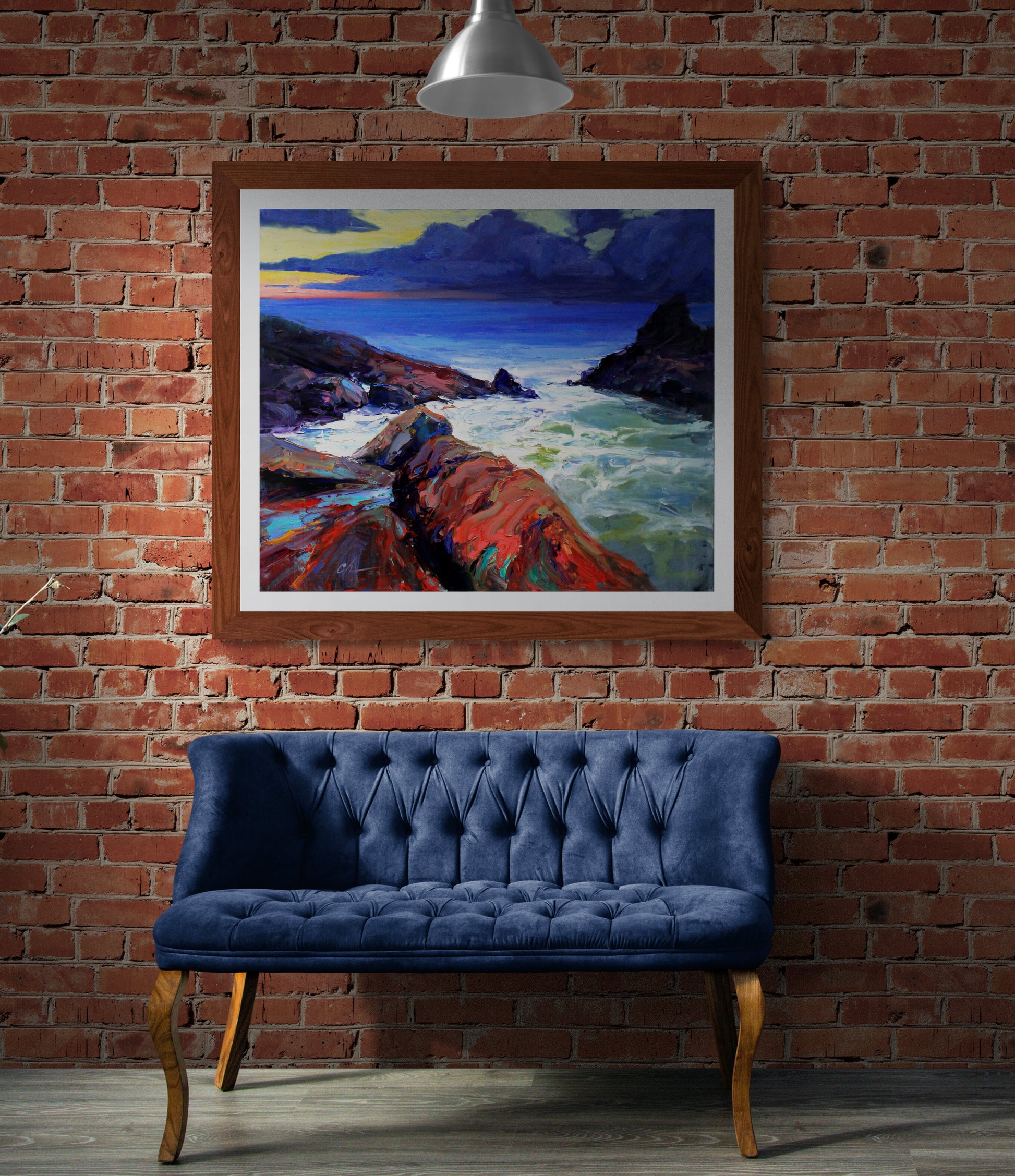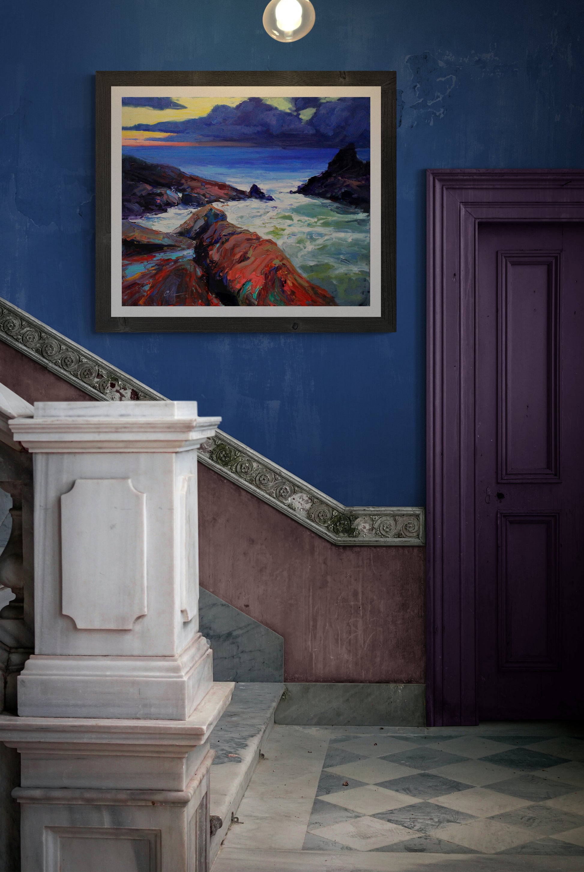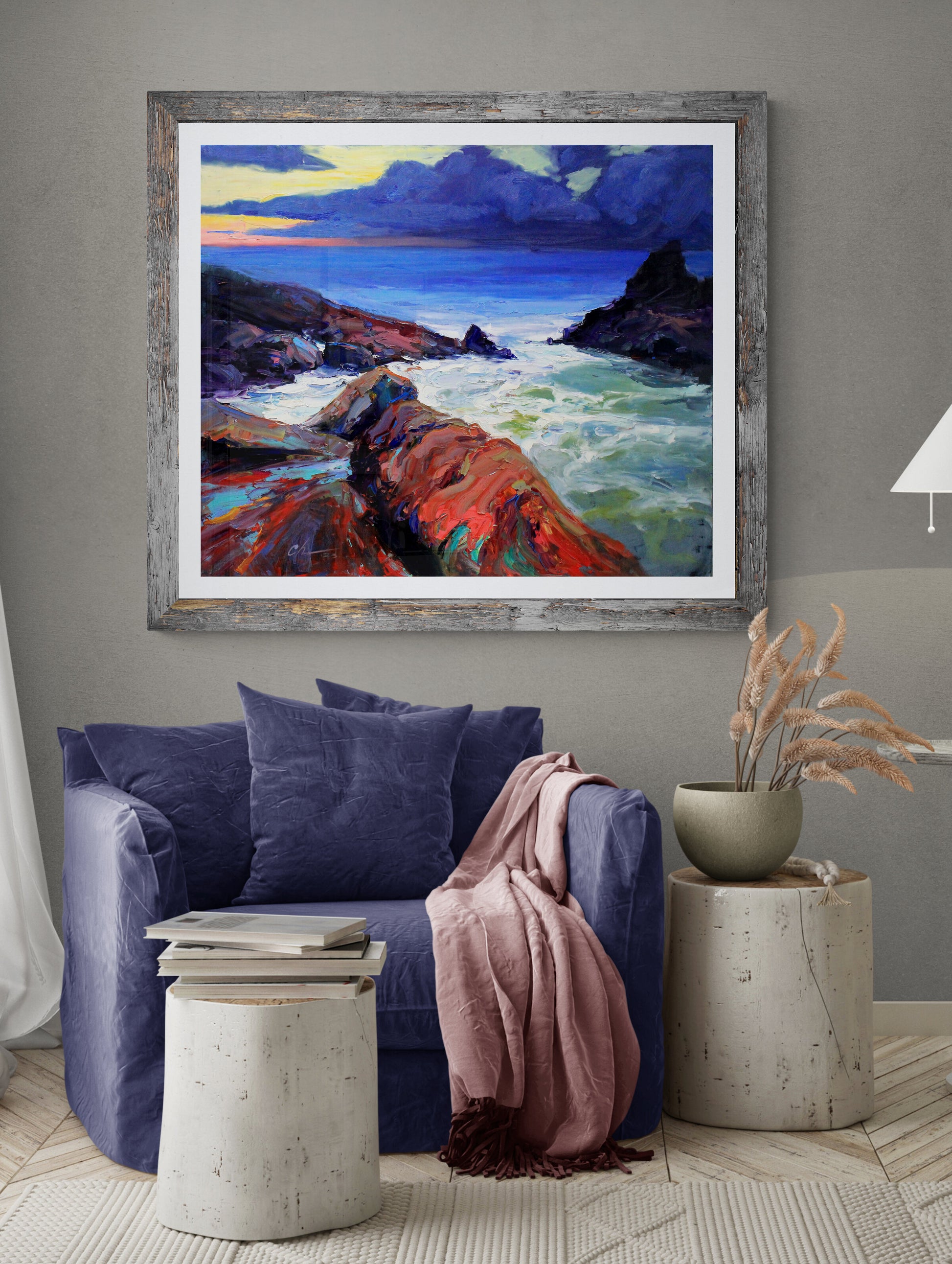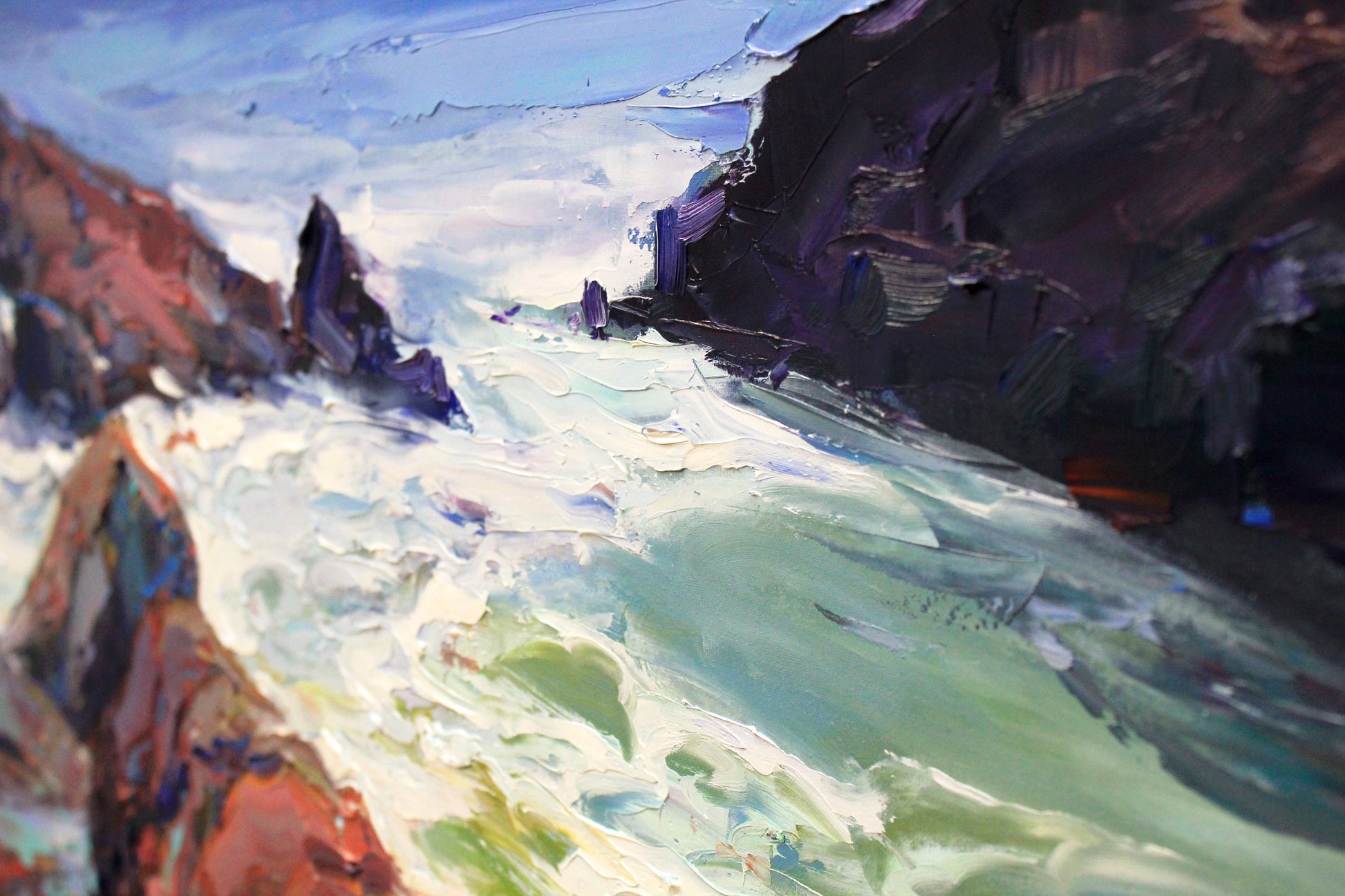 Transform your living space with this captivating original oil painting. Immerse yourself in the drama and beauty of the sea with a stunning coastal landscape that features rocks, a stormy sea, a tranquil beach, and the rugged coast. This large impressionist artwork, awash in soothing blues, evokes the essence of the ocean, making it the perfect addition to your wall decor. Bring the power and serenity of the sea into your home with this expressive piece of blue wall art.