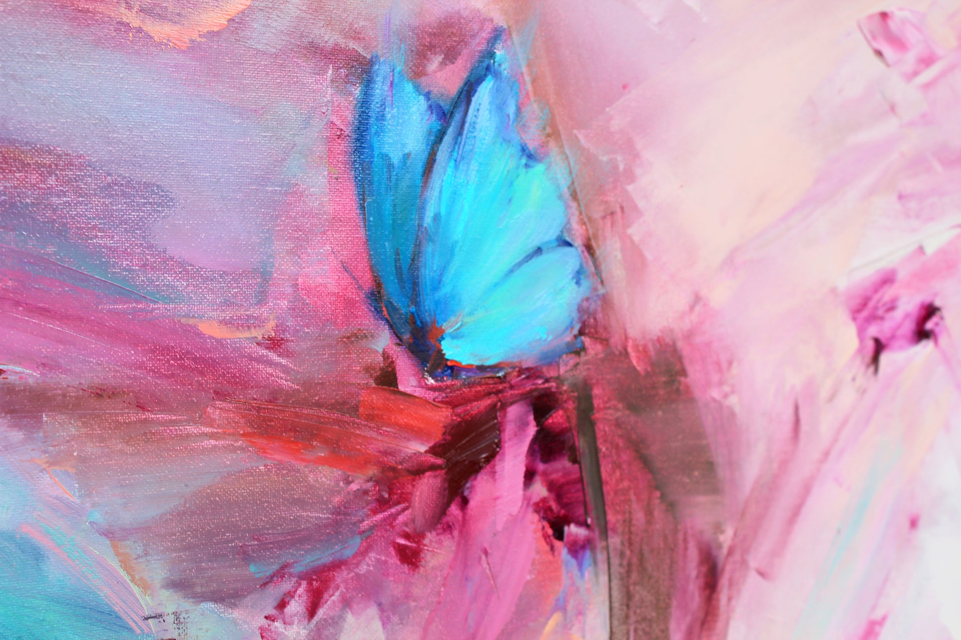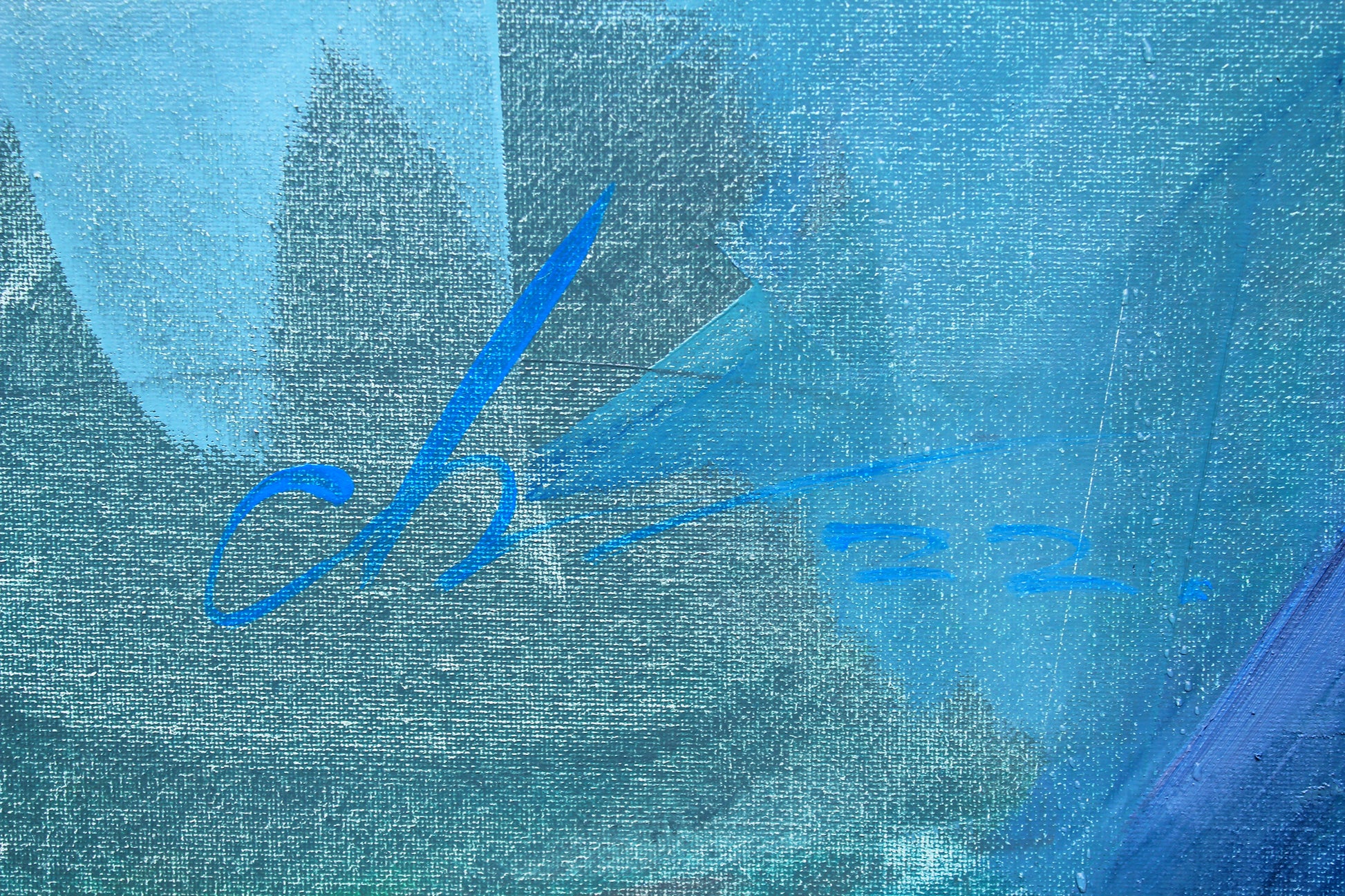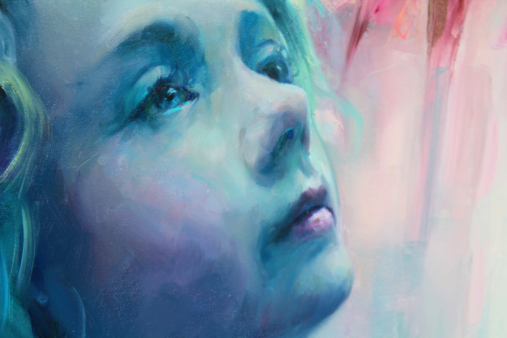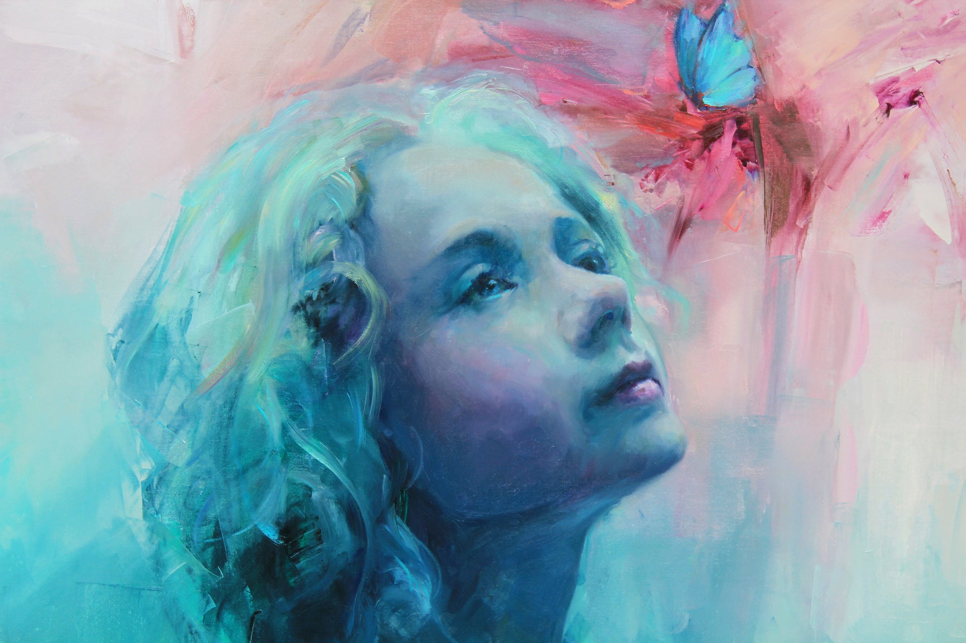 The background is a symphony of abstract shapes and hues that envelope the girl, creating an aura of energy and movement. Flecks of gold and silver dance across the canvas, hinting at the radiant spirit that lies within. The juxtaposition of bold and delicate brushwork adds a dynamic quality to the composition, echoing the complexity of the woman's identity.