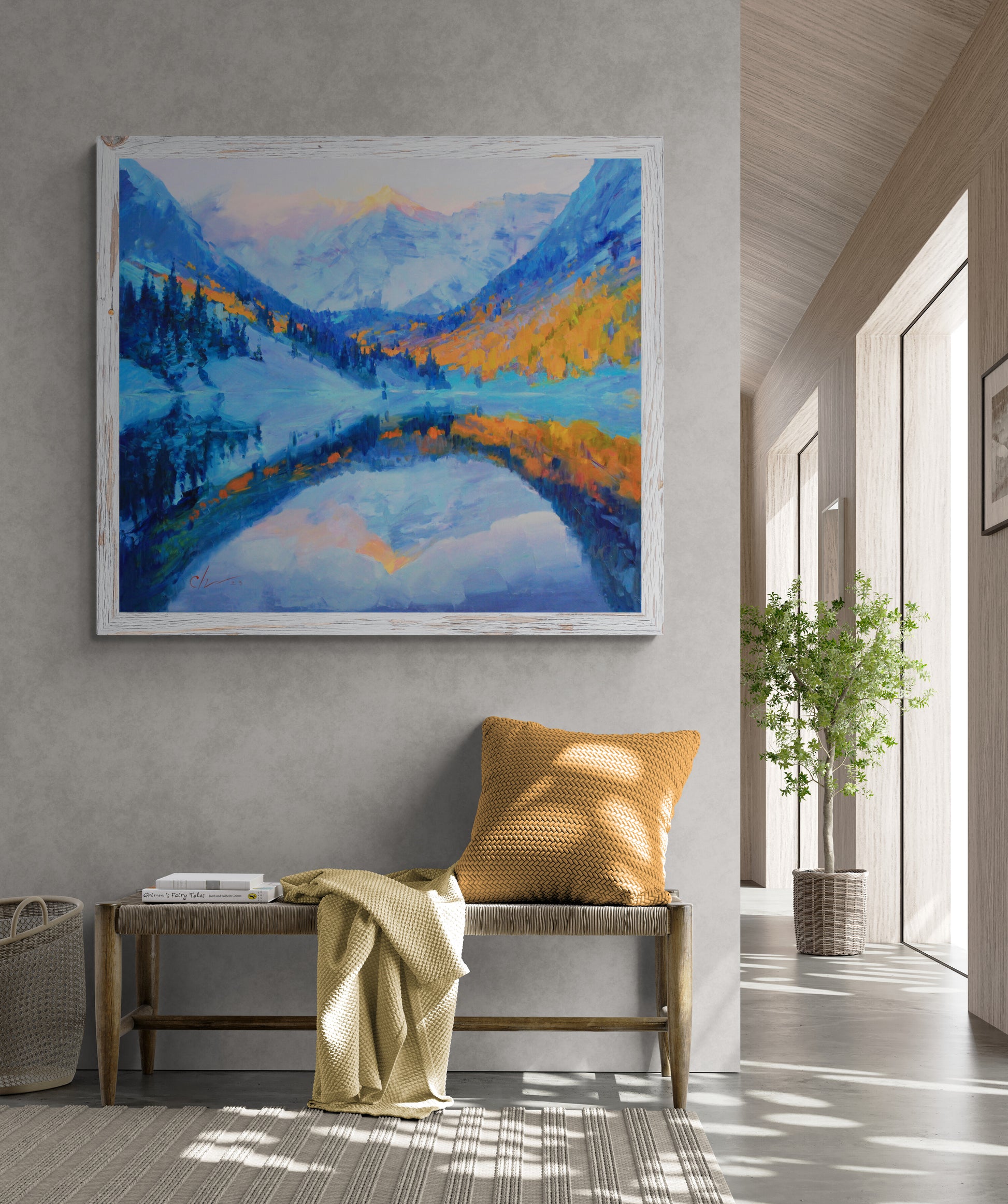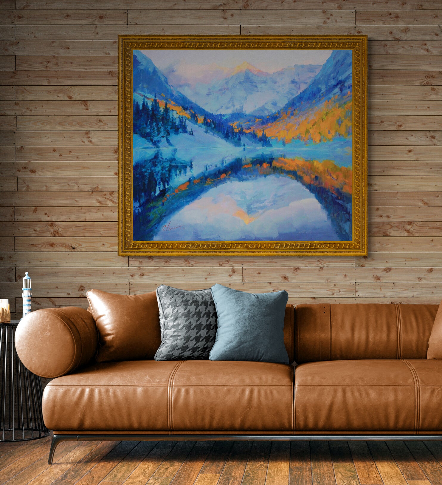 Immerse yourself in the captivating beauty of Maroon Bells in Colorado through our original landscape painting. This artwork captures the essence of the Colorado landscape, bringing to life the majestic Maroon Bells. The textured oil painting technique adds depth and dimension, enhancing the natural beauty of the scene. Let the warm maroon hues and intricate details transport you to the heart of Colorado's wilderness. Elevate your space with the allure of the Rockies using this stunning piece of Colorado wall art.
