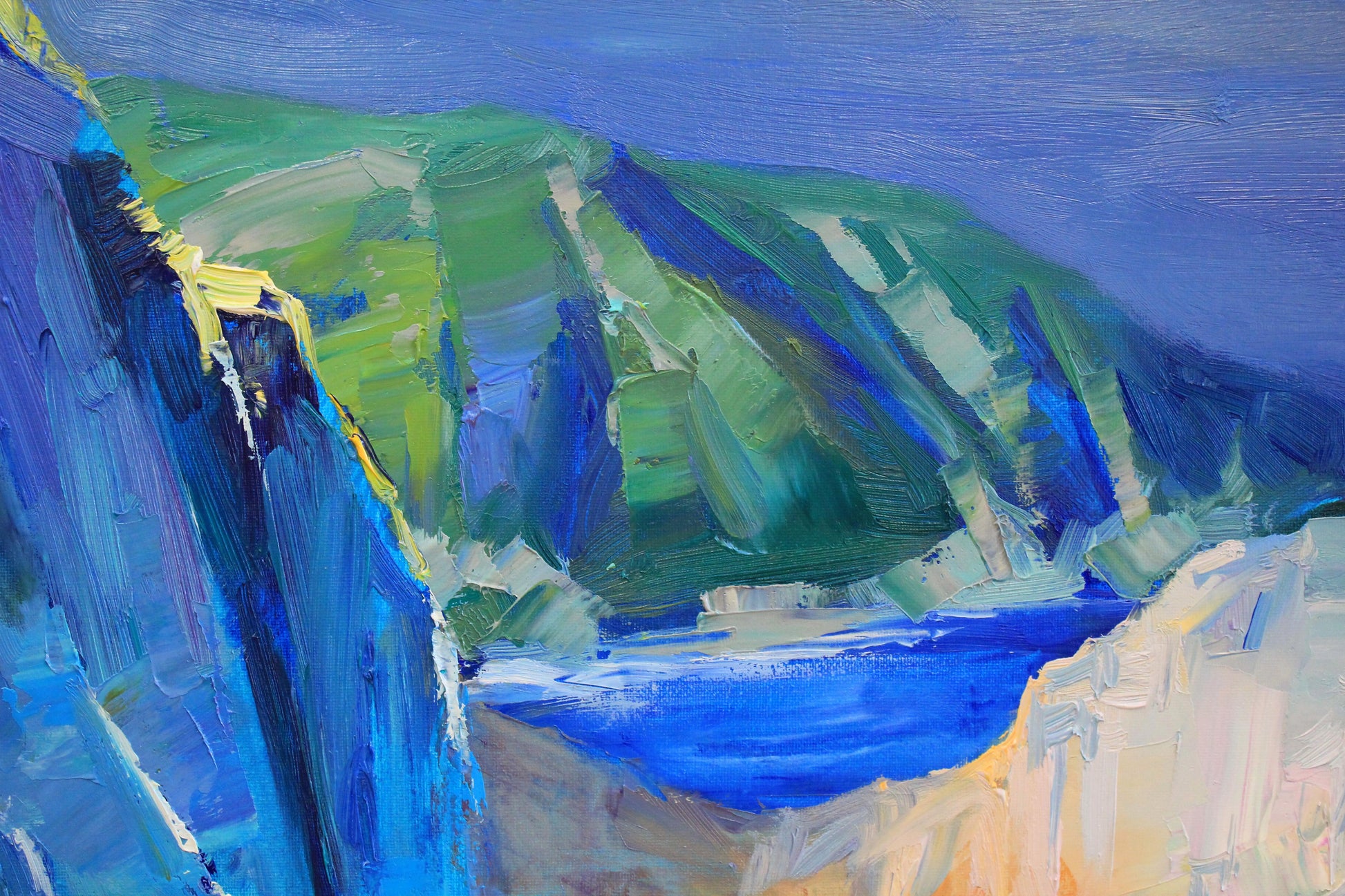 This original seascape painting captures the essence of Navagio Beach in Greece, a stunning destination known for its picturesque rocky coast and crystal blue waters. I incorporates various shades of blue to depict the serene sea and the clear sky, creating a sense of tranquility that resonates with the viewer.